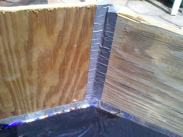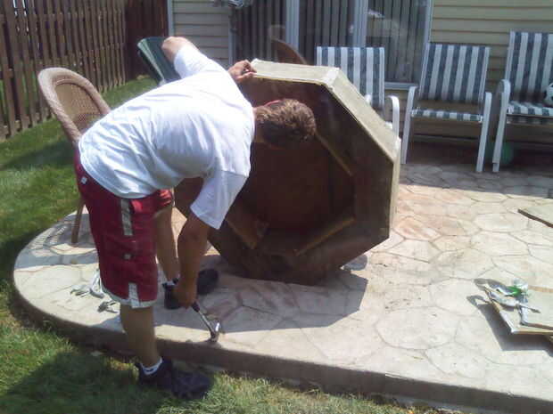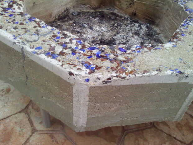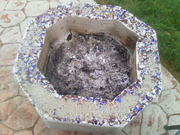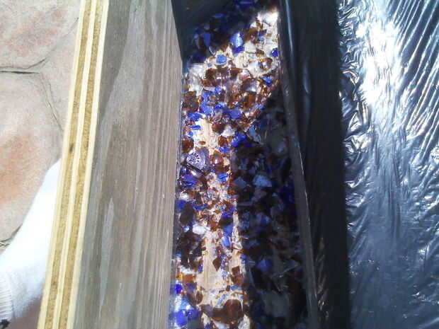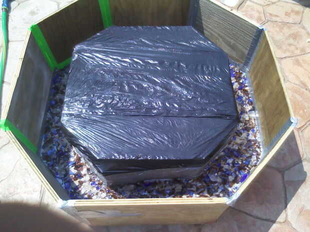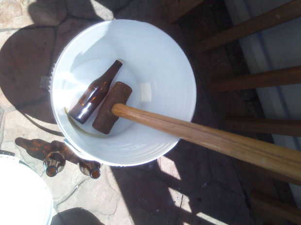Cristales rotos de botellas de cerveza y el vino fue utilizado como decoración en la parte superior del calentador. Partió por la rotura de las botellas dentro de un cubo de cinco galones con un martillo.