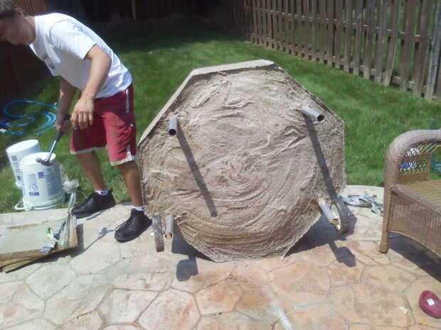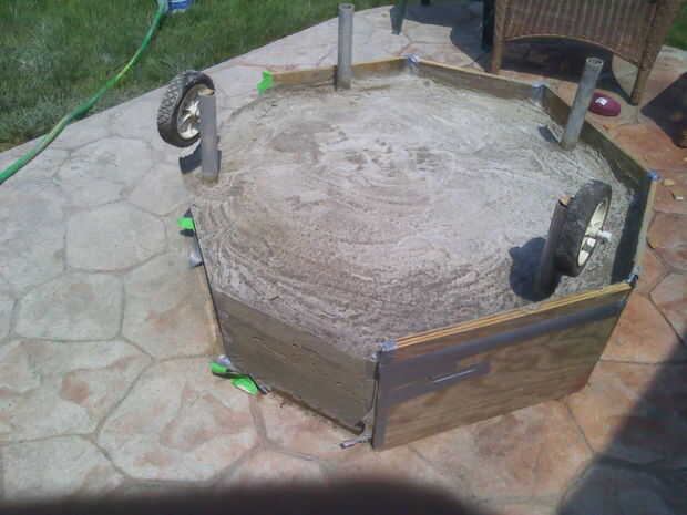 He mezclado cemento portland con arena multiuso Quikrete en áspero un cociente de 1-3 y vierte en el molde. Usé algunos alambre de pollo desde el garaje a través del molde para intentar dar fuerza al hormigón.