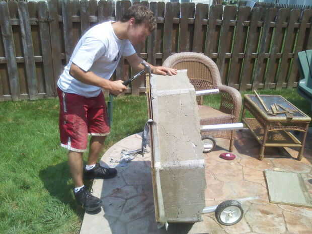 Las piernas del calentador están hechas de algún tubo de aluminio que fue rescatado de la cubierta solar de la piscina, que había conseguido rasgado para arriba. Hay cuatro piernas, dos de ellas con ruedas para que se pueda mover. Las ruedas son salvadas de un cortacésped viejo llevó aparte y fueron empernados en las tuberías de aluminio.