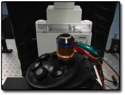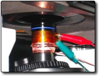Luego mezclé algunas del térmico epoxy. Coloqué el termistor pequeño en la parte superior del objetivo y aseguró que su colocación no interferiría con el microscopio. Esto es donde la computadora lee la temperatura de la muestra. Puesto que el objetivo se acopla térmicamente al aceite usado y el aceite se acopla térmicamente a la diapositiva, el termistor superior efectivamente lee la temperatura de la diapositiva. Aislamiento de la diapositiva del sujetador de diapositiva también es necesario y puede hacerse con cualquier material térmicamente aislante.