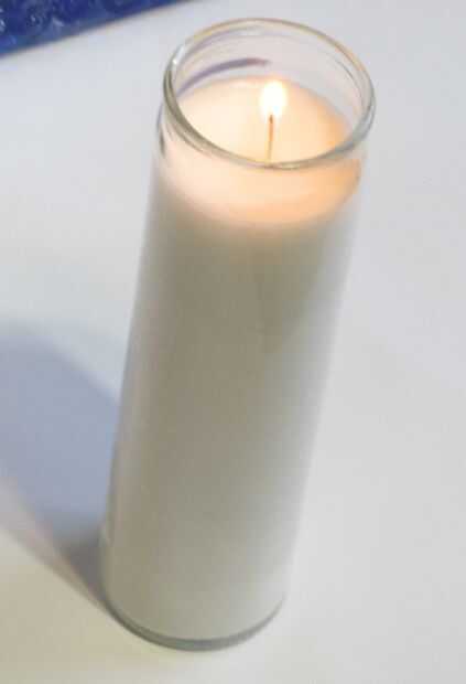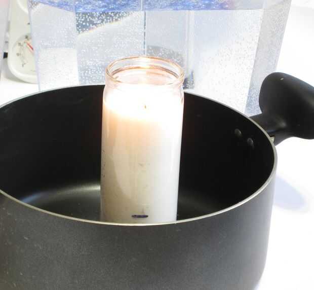 Luz de la vela. Tenemos que quitar toda la cera del frasco de la vela. Deje que la vela derrita la primera mitad por sí mismo, entonces usaremos la olla con agua caliente para derretir el resto.