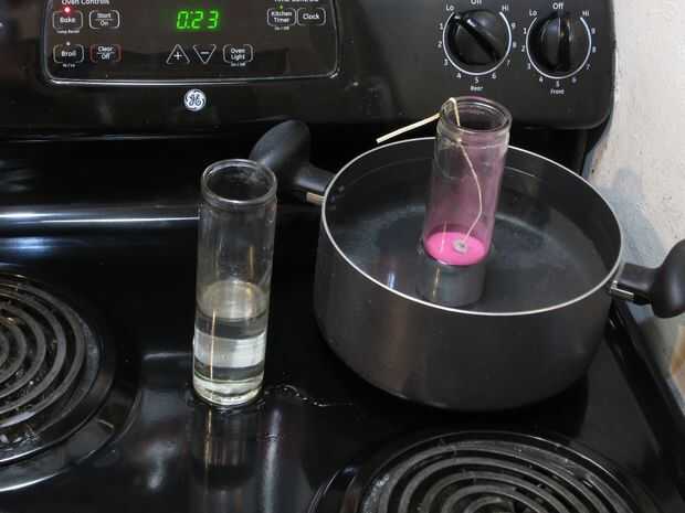 Coloca el frasco con arena y la mecha en el molde y retire el tarro de cera caliente. Tenga cuidado, use guantes de sostenedor de pote!