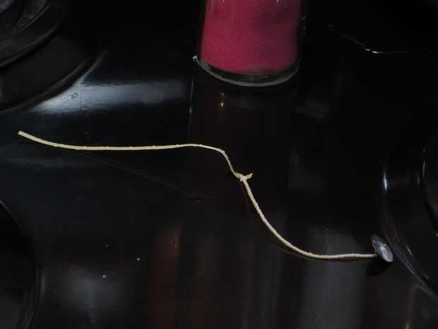 Colocar un lazo de la bolsa de basura hasta el extremo superior de la mecha (el extremo sería luz). Coloque la mecha en la jarra, centrado en el metal extremo de la mecha en la arena. Doble el lazo de la bolsa de basura sobre la jarra para mantener todo en su lugar.