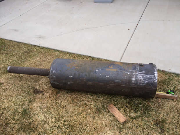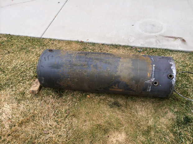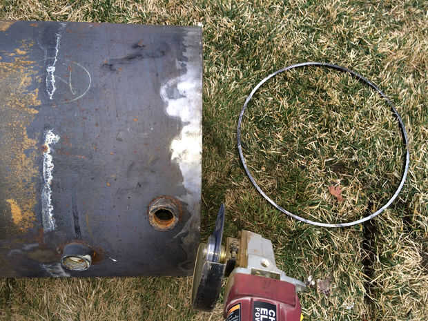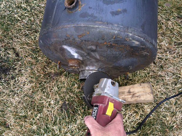 1. lo primero que hice fue cortar la parte inferior del tanque abierto. El tanque tiene un domo cóncavo en la parte inferior que está soldada a la pared exterior. Usé una amoladora con disco de corte de metal para cortar la soldadura. (Usar unos 4 discos y que el corte de la cuña abierta para evitar que los discos de enlace)