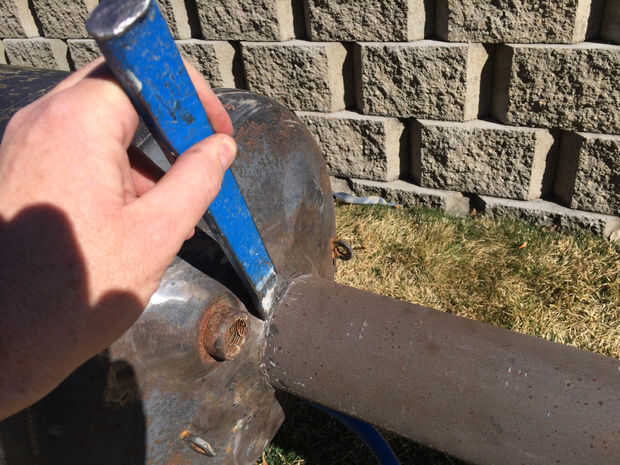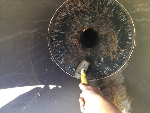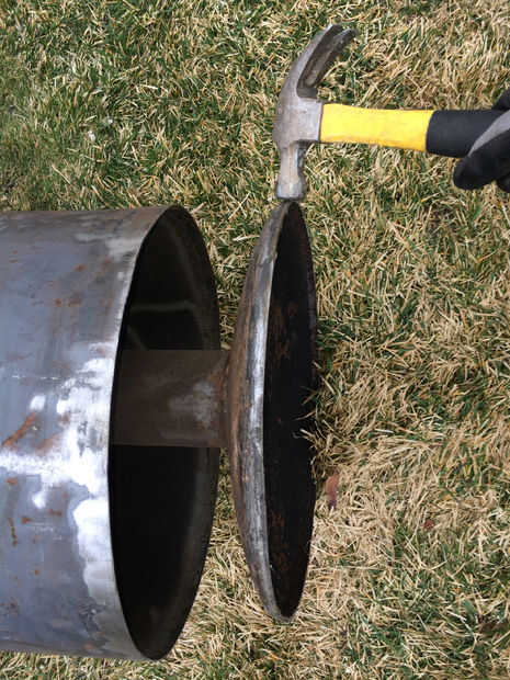 5. usando un cincel de metal y un martillo aplastado la tapa del tanque y el domo. Esto hará más fácil la soldadura. (también es necesario moler el interior del depósito y fuera de la tubería en los puntos de soldadura, ya que la mayoría tanques están revestidos con vidrio "muy difícil de soldar descubrí esto la manera dura"