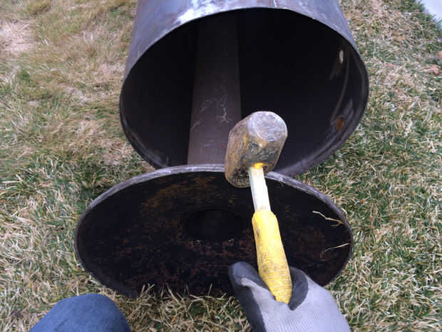 3. empujar el tubo hacia fuera el fondo del tanque y en la forma de la cúpula cóncava (utiliza un martillo grande) para que se deslice en el tanque.