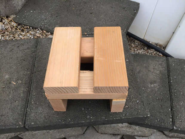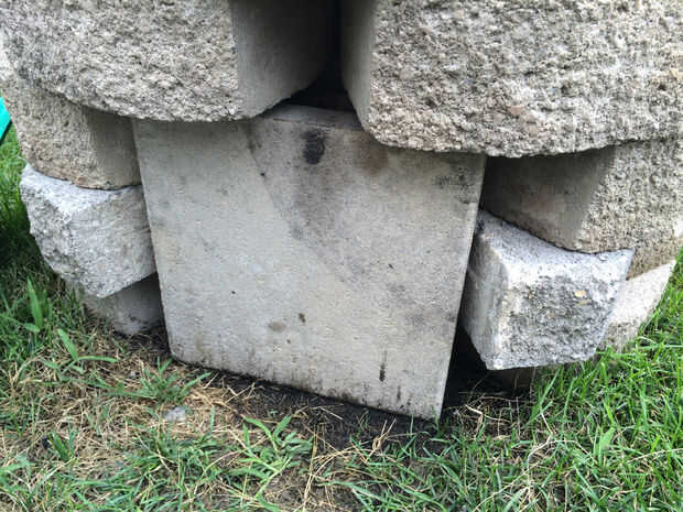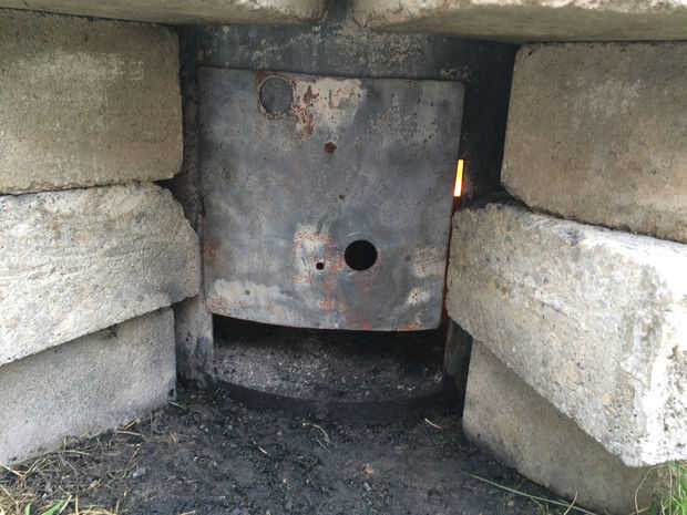 Para leña, he dejado una apertura en los bloques del muro de contención para cargar madera y limpiar la ceniza. La puerta está sujeta con un alfiler en la pared del hueco de la puerta, dejando una abertura en la parte inferior para entrada de aire y calentador. Este está cubierto con bloques de pavimentación.
