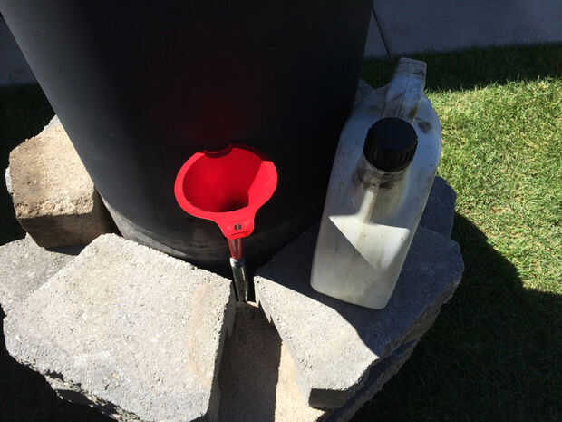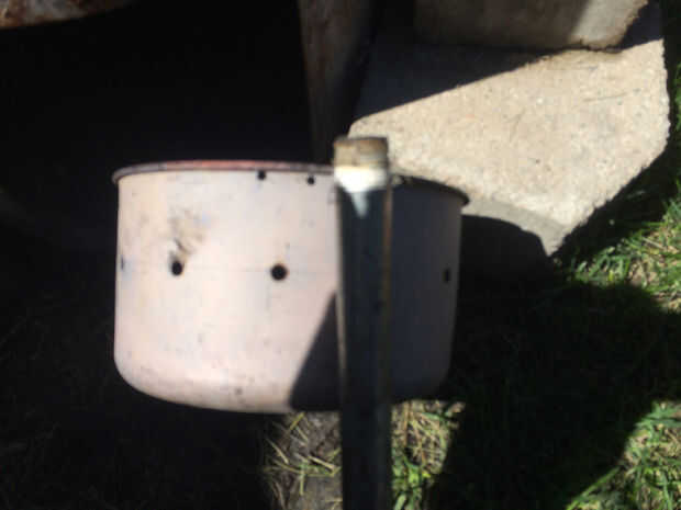 Para mezcla de gases de aceite (biodiesel) quema utilizo una olla vieja con agujeros perforados en los lados, un viejo peso de barra para retención del calor. No hay mucha ceniza para cerrar la abertura e instalado un tubo de llenado, el bote es de 1 litro que se llenan de un embudo y luz cayendo un trozo iluminado del papel hacia abajo de la chimenea.