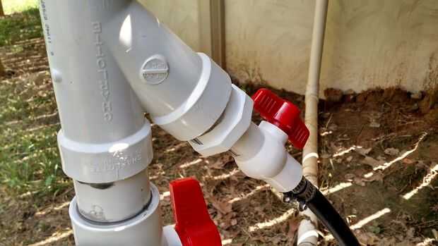 La parte superior es un adaptador liso 1 1/2""Y"con un adaptador roscado de 1 1/2 a 1/2" en un lado con un 1/2" macho a macho niple roscado a una válvula de bola de 1/2" y 1/2" rosca adaptador acanalado que se desliza sobre el tubo de vinilo. Usé dos abrazaderas en cada manguera para evitar fugas. Lije todas las superficies lisas antes de pegar para asegurar un buen sellado. IMPORTANTE: No pegar las piezas roscadas. El pegamento pondrá mucho antes de llegar los hilos firmemente. Use grasa de plomería o Caño para sellar las roscas. Incluso cinta de teflón puede tener fugas debido a la alta presión.