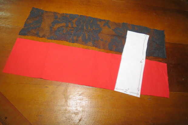 Recorte un 2 "x 12" pieza de material con margen de costura de ¼". Se necesita 2 piezas en material de la guarnición roja y uno en material del cordón.