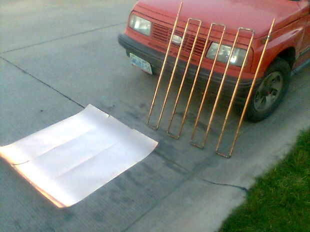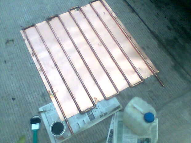 Usted puede diseñar su exchnager en una serie o en paralelo diseño. Para mí, me chossed la serie uno. Así que he usado 1 metro de largos tramos de tuberías de 1/2"(8 piezas). Además de los más pequeños, que da un total de 9 metros de tubería. Entonces soldó con autógena las hojas de cobre para aumentar el área de absorción.
