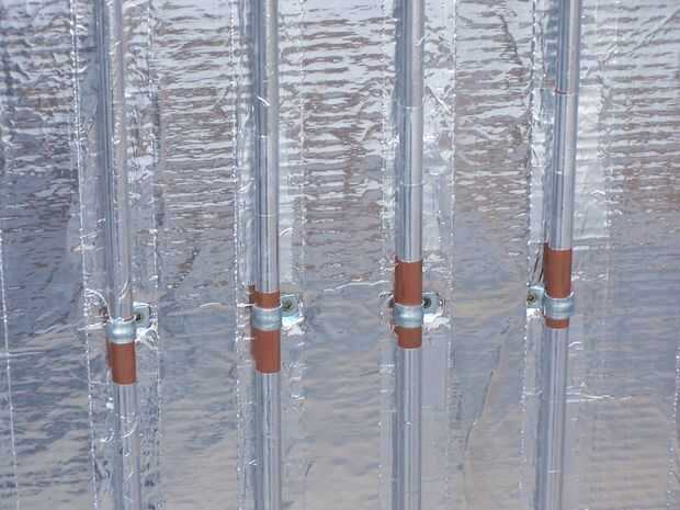 Cuando los tubos están asentados los podemos amarrar con esas piezas típicas se usan para agarrar tubos a las paredes, pues nosotros lo atornillaremos una los listones hemos instalado previamente.