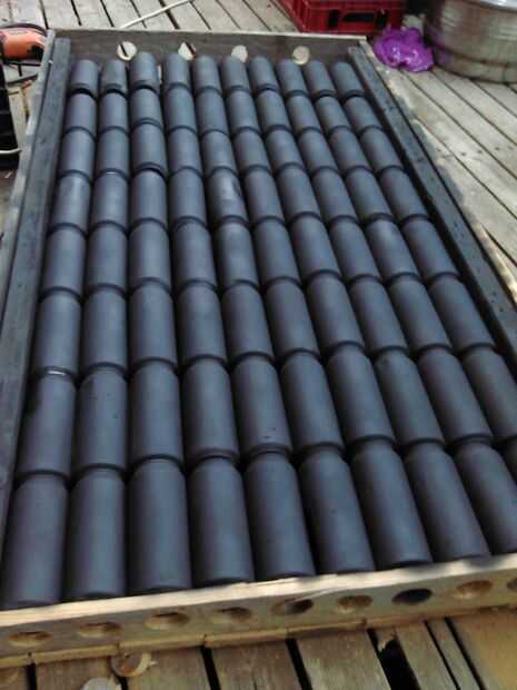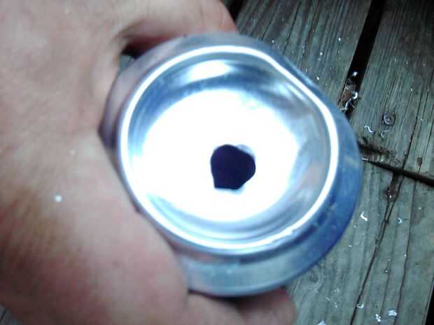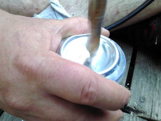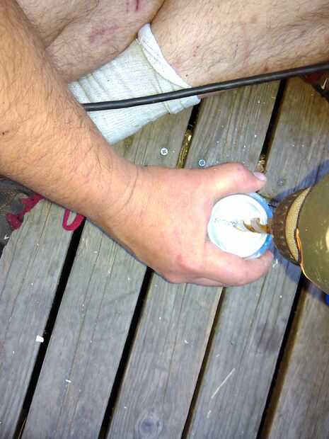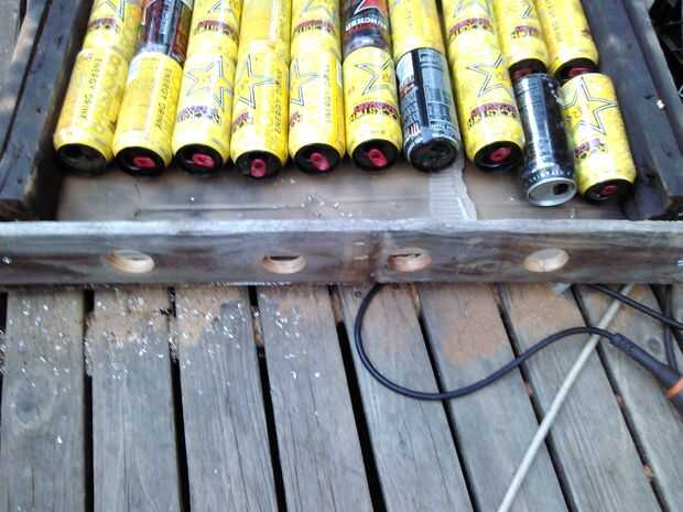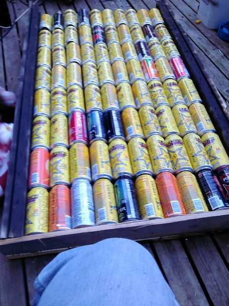 Usando un taladro de 1/2", taladro un agujero en el centro de cada uno puede, este calentador cabe un total de 80 latas. una vez tengas en leas la fila inferior, puede usar el serrucho para perforar agujeros en la parte inferior de la caja, directamente debajo de cada fila de latas, éste era anchos, 10 latas por lo que 10 agujeros perforados en la parte inferior. En la parte superior, que desea restringir el flujo de aire un poco para que tenga tiempo al calor, por lo que demandó la misma Sierra de agujero de 1", y sólo 4 orificios espacian en la parte superior del calentador.
