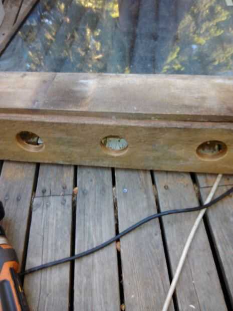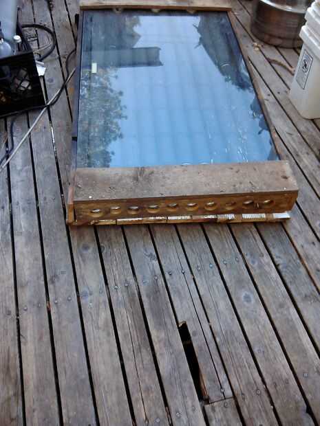 Una vez instalado el vidrio, es el momento de añadir arriostradas en la parte superior e inferior del calentador, para esto, volví a la madera de palet, cortar dos piezas, 32" largo (el ancho de mi caja) y una vez que se fija sobre el vidrio en la parte superior e inferior, mantiene el vidrio en su lugar y mantiene en movimiento.