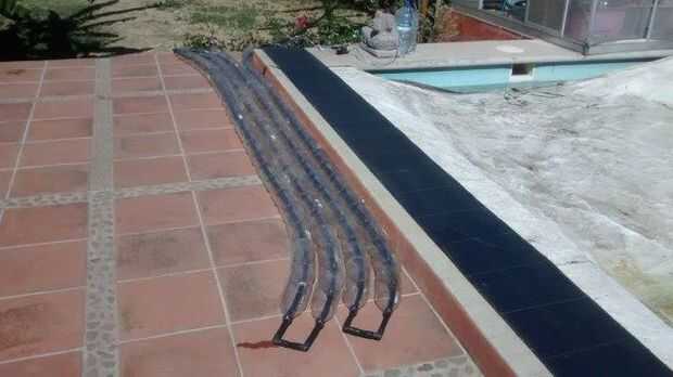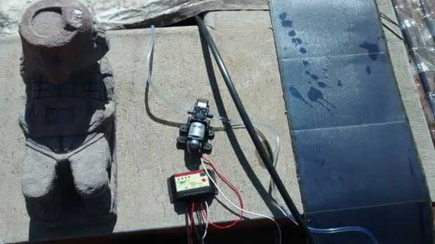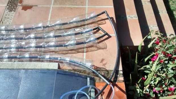 Se llena el deposito de agua y se introduce el extremo de la manguera de la aspiración de la bomba y el extremo de la manguera viene del colector con el agua caliente.