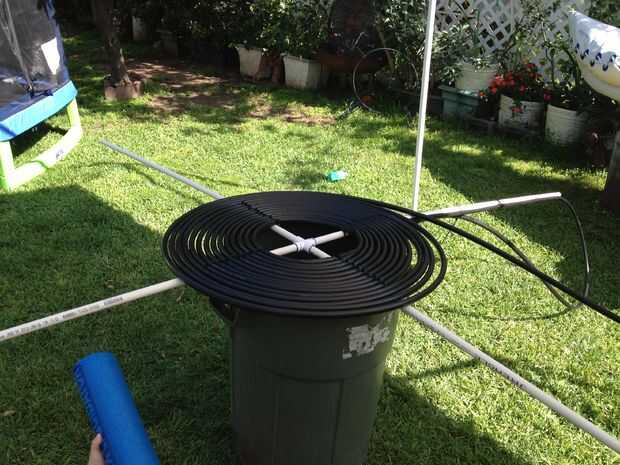Asegúrese de tener espacio para moverse alrededor del área de trabajo, como que va a hacer un montón de caminar (sobre todo en un círculo). Configuramos una escalera con una viga transversal de tubo que la manguera de goteo. Esta configuración no funcionaba muy bien como esperaba pero ayudan a evitar que la bobina consiguiendo horriblemente enredado. El marco era la instalación de una papelera puede que llena parcialmente de agua para estabilizar caiga.