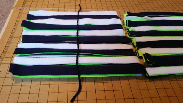 A continuación, le pone sus colores uno encima del otro en un patrón alterno. Esto evitará tener mechones al azar de color en un solo punto de su pom pom. Mis tiras apiladas se compone de 5 alternando capas cada - 2 azules, 2 verdes y uno blanco.
