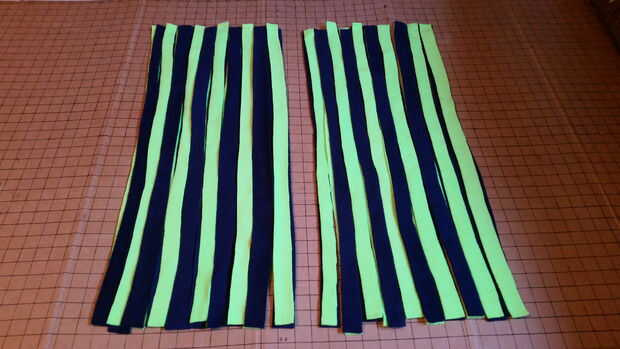Luego, corta tus franjas a la mitad para que tengas 2 secciones que son aproximadamente 15 pulgadas de largo.
