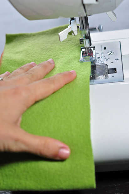 6. Tome la pieza rectangular (que todavía debe ser doblada por la mitad) y coser a lo largo de la longitud de la arista más larga. Repita en el otro lado. Gire a la derecha de la pieza hacia fuera.