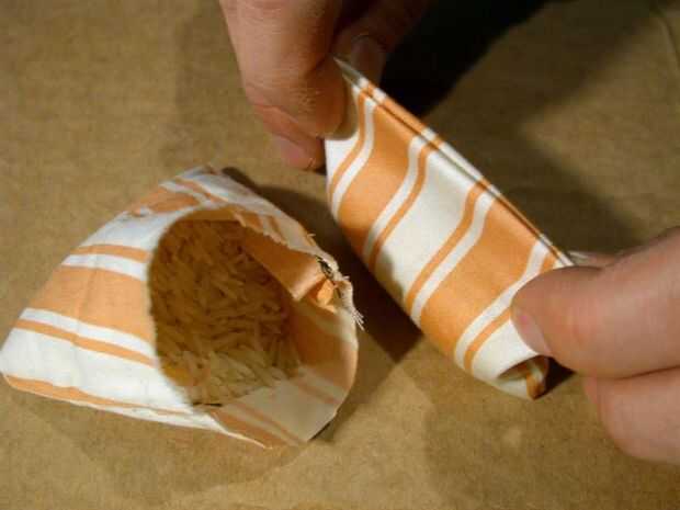 Comenzar con un trozo de tela un poco más amplio de lo que quiere la bolsa acabada para ser y un poco más de dos veces tan de largo. La anchura extra es el margen de costura. Por cierto, usted no necesita quejarse con un montón de corte, corte el borde y rasgar a la tela. A continuación doblar la pieza por la mitad con el revés y ejecutar a través de su máquina de coser para coser los dos lados juntos. Girar a derecha hacia fuera y relleno con arroz. Meta los bordes crudos restantes dentro y coser la abertura cerrada.