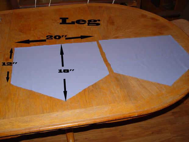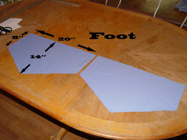 Los calentadores se hacen de dos secciones separadas, el pie y la pierna. Y cada sección es de un interior y un tejido externo. La tela externa debe ser bastante resistente para soportar un abuso (como caminar) y el tejido interior debe ser una suave y esponjosa lana o algodón tipo tela para la comodidad y calidez. Una yarda de cada uno debería ser suficiente. Marque y corte a la tela exterior (azul) para las secciones de la pierna utilizando las dimensiones que se muestra en la foto 1. Marque y corte a la tela exterior (azul) para las secciones de pie utilizando las dimensiones que se muestra en la foto 2. Estas dimensiones son para el pie de un tamaño 9 hombres y las secciones pie y la pierna resultadas para ser un montón grande. Por lo que se puede ajustar por consiguiente. Luego cortar de la tela (blanco) interior usando los pedazos azules como sus patrones (Foto 3).