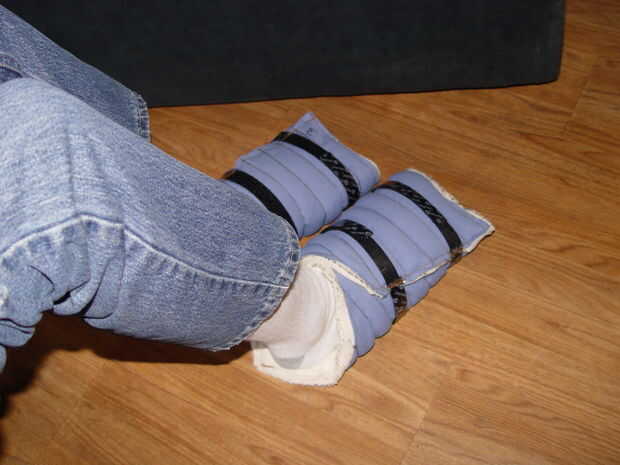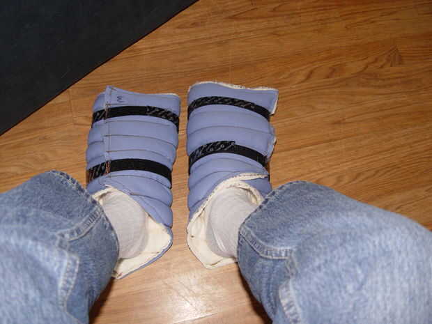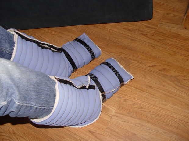 Poner la sección de pie abierto en el suelo con la tela (blanco) interior hacia arriba y la "V" de la tela hacia el talón. Coloque su pie en la tela y envolver bastante firmemente alrededor de su pie. Envuelva la malla velcro "colas" alrededor de la bota y sujételos al lado de "gancho" de la cinta (Foto 1 y 2). Las botas se pueden utilizar con sólo las secciones del pie si quieres. Para el calor agregado, enrolle la sección de la pierna alrededor de la pantorrilla con la "V" de la tela apuntada hacia abajo hacia su sanación. La sección de la pierna se puede deslizar hacia abajo para encontrar y se superponen con la sección de pie para hacer un ajuste relativamente apretado (Foto 3).