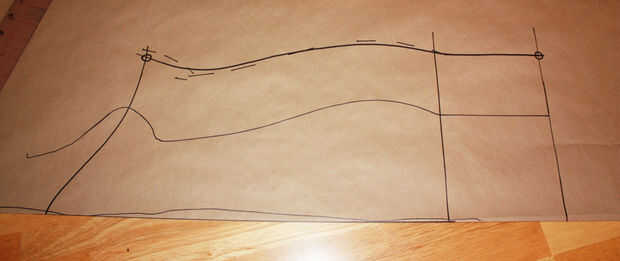 quería pata al abrigo sobre mis botas para que dibujó la línea para bajar sobre el talón y la cuesta frente a sentar encima de mi bota. Yo también suavizan la línea quebrada donde he añadido 3" para que las curvas fluyeron más suavemente en el patrón terminado. Es importante que la curva del talón en mente ya que es donde el calentador de la pierna sostenga en su lugar. Ya que no dobladillar los extremos, esta línea de diseño puede recortar más corto después de ser cosida y juzgado.