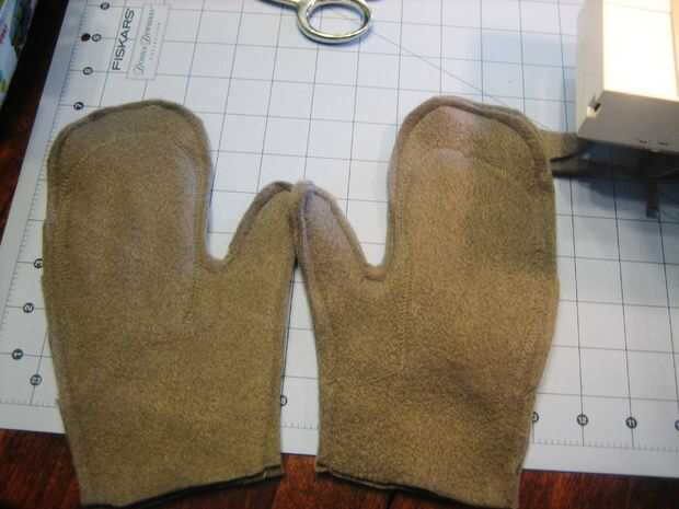 Coser juntos, derecho lados juntos.  La bolsa debe estar en el interior de cada manopla.  Asegúrese de que los pulgares de sus mitones están en lados opuesto!!! No hacer dos manoplas de izquierda o derecha.  Voltee el lado derecho hacia fuera.