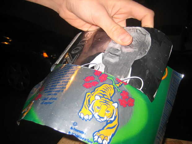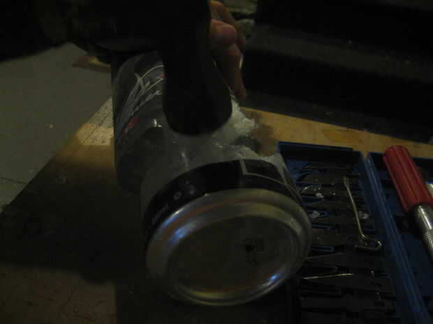 a continuación, tenemos que cortar la lata. En primer lugar necesitamos cortar la parte inferior de las dos latas, en debe ser unos 2 cm y la siguiente 2,5 cm. Luego realizar pequeñas muescas a la parte superior de la corte por lo que podemos romper el resto de la lata en dos sobre tiras de 7 x 21 cm. Luego usted puede sacudir el hielo o esperar a fundir.