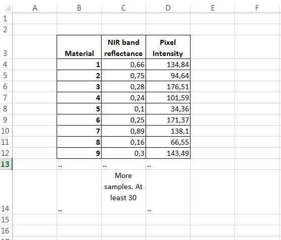 Construir una tabla con los valores de reflectancia vs intensidad de píxeles y cada fila con el número del material de la etiqueta.