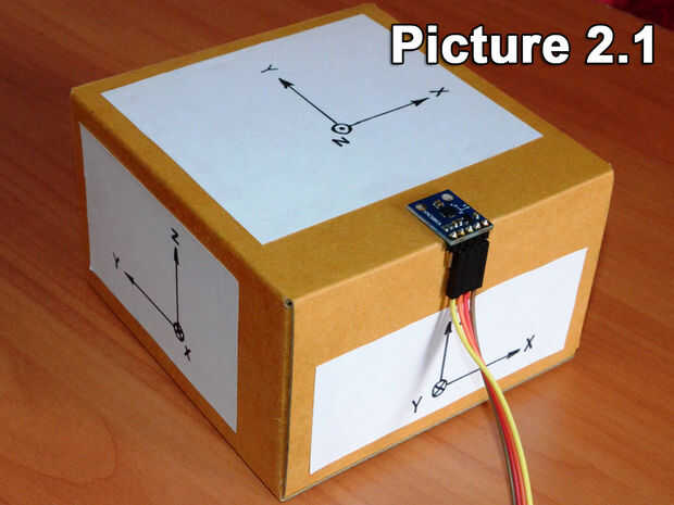 Para el proceso de calibración debe hacer la caja de calibración especial (cuadro 2.1). Para hacer esto he usado una caja de papel, pero puede utilizar un plástico uno, una barra de madera o algo más también. Deben unirse al módulo de magnetómetro con la caja (por ejemplo con pegamento) como se muestra en el cuadro 2.1. En las caras de la caja debe dibujar el sistema de coordenadas según el sistema de coordenadas del módulo magnetómetro.