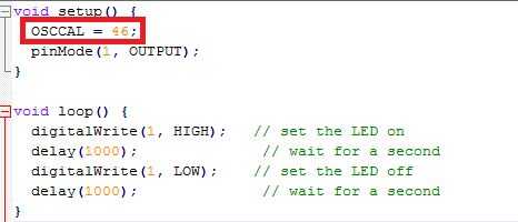 En mi caso, mi valor OSCCAL es 46, tan en mi void setup() se utilizo "OSCCAL = 46", para cada proyecto que hago con este ATtiny específico