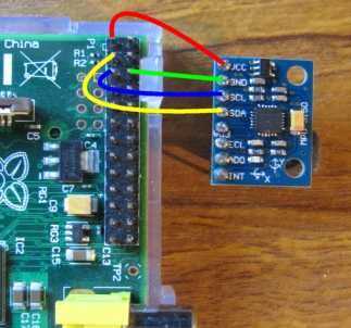 Las obras de acelerómetro/giroscopio/magnetómetro MPU-9150 igualmente bien con el Raspberry Pi y tiene las ventajas sobre la XLoBorg que incluye la función de giróscopo. Requiere sólo 4 conexiones a los pines GPIO de la Pi como abajo y como se muestra en la imagen.
