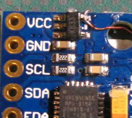 Si, el traductor nivel toma los pines SDA y SCL de la Arduino a nivel de 5V y presenta a 3,3 v para el MPU-9150. Para ello, requiere una fuente de 5V en un lado y a 3, 3V de la fuente en el otro. Afortunadamente los tableros MPU-9150 comunes contienen un 3.3V regulador, pero lamentablemente su salida no se presenta en ninguna de las patillas. Por lo tanto es necesario soldar un alambre fino con el conector de salida del regulador como se muestra en la foto.