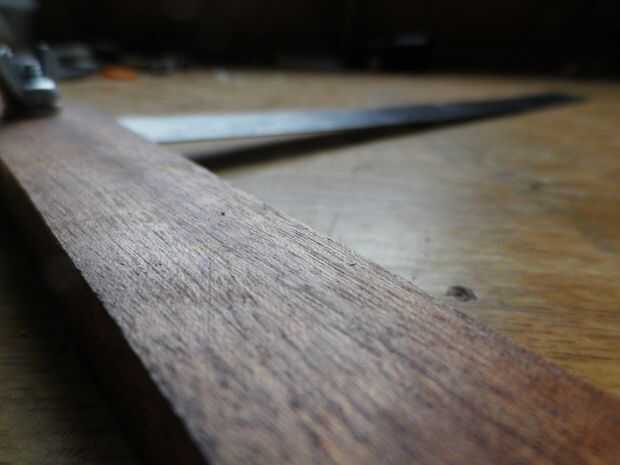 Se hace cortando una ranura en un trozo de sapele y luego deslizar una regla y asegurándolo con un entrenador perno arandela y tuerca de mariposa, el final es madera bálsamo que contiene aceite de linaza y cera de abejas.