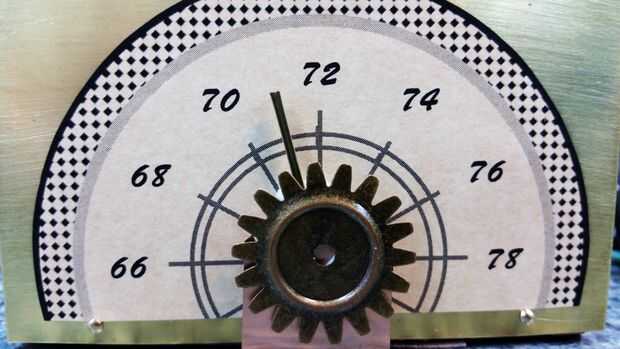 Un proyecto electrónico y mecánico muy fácil de hacer es crear un estilo "steampunk" calibrador de la temperatura de un motor microservo. Este proyecto fue realizado para monitorear una gama estrecha de temperaturas de la habitación, de 66 grados F a 78 grados F. Es muy fácil de extender este rango de temperatura para sus propias necesidades.
