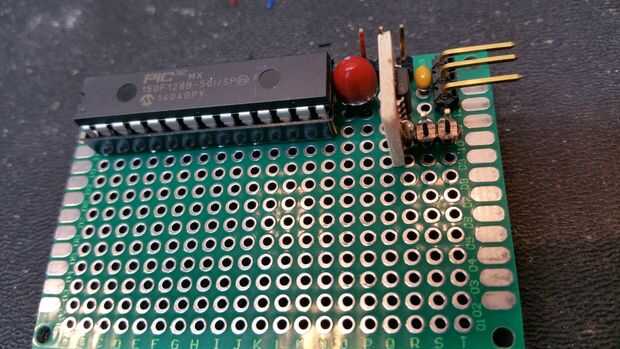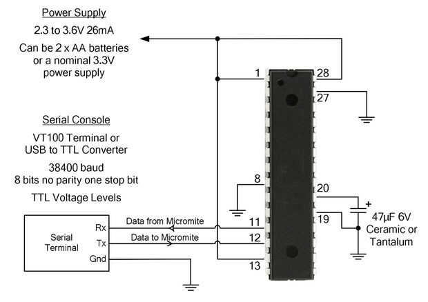 El manual proporciona un ejemplo esquemático de un circuito básico de GCMICROMITE. A esto se sumó las conexiones a la microservo en pin 4. Las conexiones de tres servo son tierra, 6V y señal. Es la línea de señal la unidades de la CGMICROMITE en el pin 4.