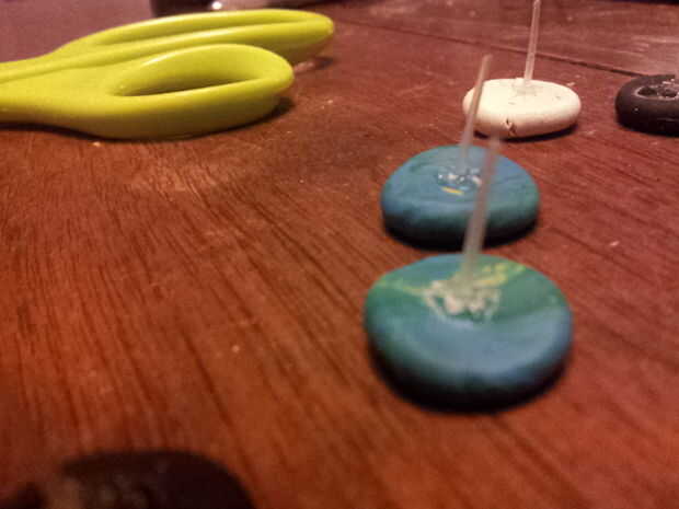 Ahora a pegar sus postes en los discos de arcilla y dejar secar.