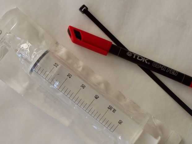 Necesita una jeringa, una brida de plástico, un rotulador y un cuchillo.