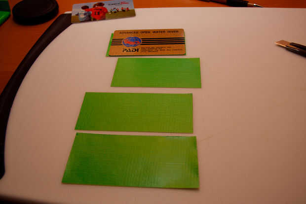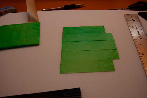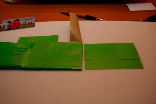 A continuación ponga las piezas de tiro a lo largo del extremo izquierdo, colgando de la parte superior/inferior alrededor de la mitad de la cinta. Recortar el lado izquierdo por lo que es aún.