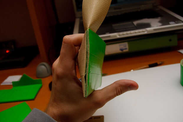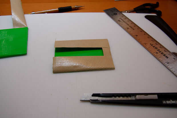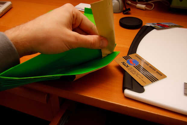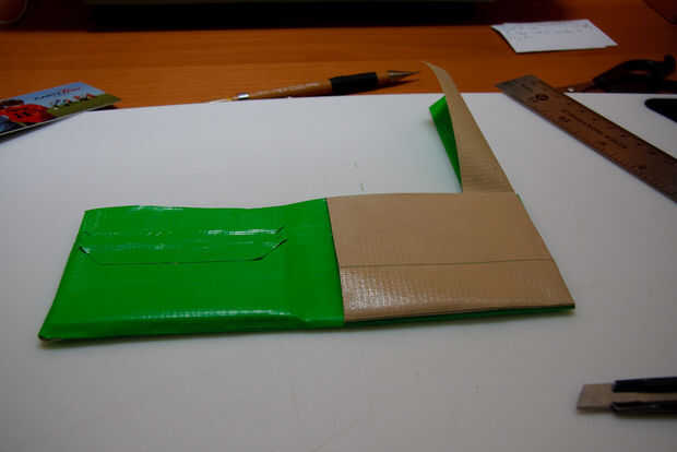 Corte una pieza 4 pulgadas largos y 2 el ancho de la bolsa. Envolver la pieza de 4 pulgadas alrededor de la parte delantera de la bolsa y la parte posterior de la cartera. colocar las 2 piezas en la parte superior e inferior de la bolsa que envuelve más al frente de la cartera y dentro de la bolsa de dinero. Asegúrese de que al despegar el interior Embalaje piezas así que usted puede fijar la parte superior de la bolsa. Envuelva la pieza larga a la izquierda de la carpeta hacia abajo sobre el lado derecho de la cartera y recorte. Cortar una pieza de la altura de la bolsa, cortarla por la mitad a lo largo y corte las esquinas. Se usa para envolver el borde de la bolsa. Listo!