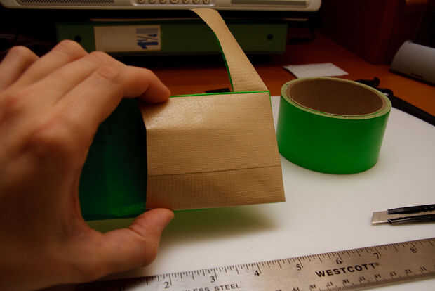 Envuelva la cinta de lado derecho hacia abajo para asegurarlo la bolsa en su lugar. Recorte la parte inferior.