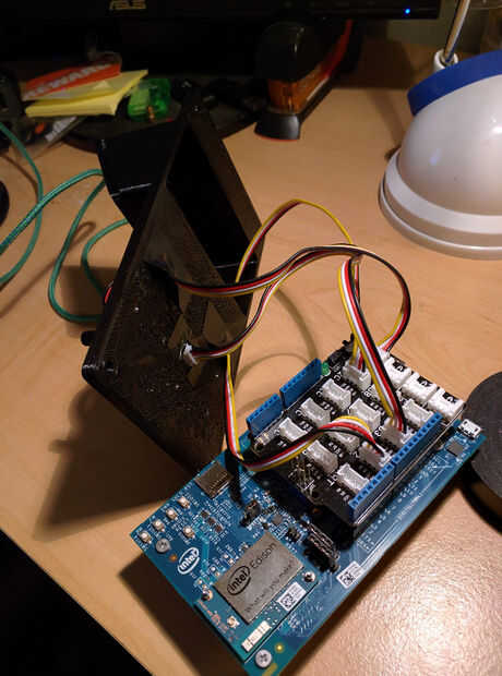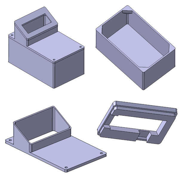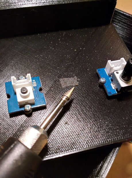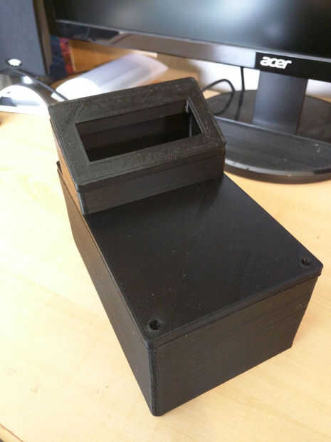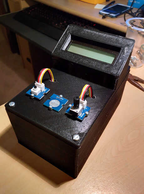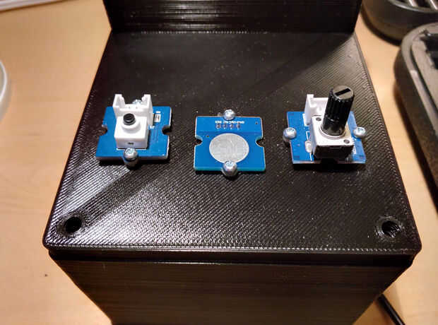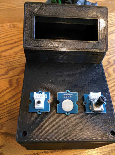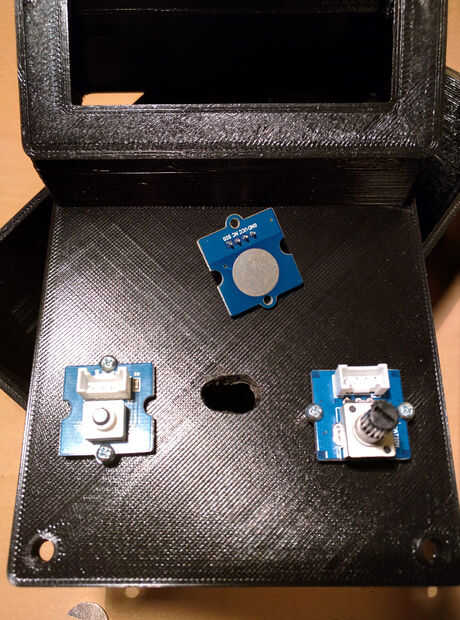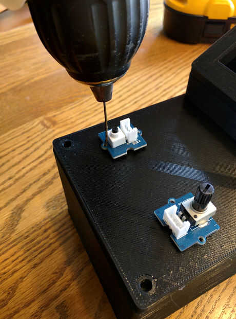 Usted notará que no hay ningún lugares para los botones y la perilla en los modelos. Esto es debido al diseño de los componentes de Grove (más sobre esto más adelante). Necesita perforar los agujeros de montaje (demasiado pequeño para los tornillos pueden cortar hilos) y un pase a través del orificio para los cables. En retrospectiva debo han modelado las salidas, por lo menos. La pantalla LCD se conecta a la pieza de la tapa pequeña que se pega en la tapa más grande. Debido a un error conceptual en el modelo (corregido que en los archivos adjuntos) mi LCD se sujeta con cinta aislante, que parece estar funcionando bien y puede ser una opción si la perforación en la tapa parece problemática a usted. Usted también tendrá que coincidir con perforar la tapa principal de la base (otra vez, insuficiente dimensionamiento el los orificios para los tornillos pueden aprovechar el agujero).