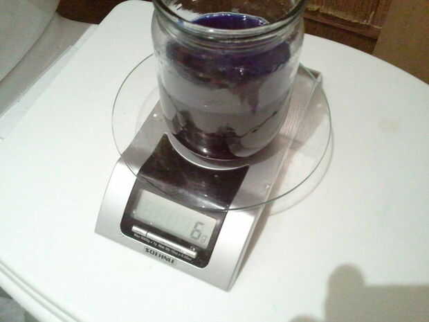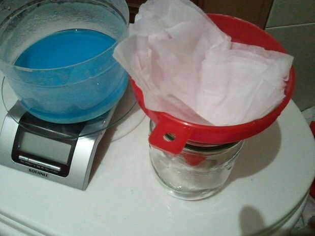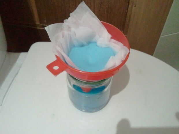 3. filtrar la solución a través de embudo con papel de filtro colocado en él. De nuevo, utilice el embudo grande. También al final la velocidad de la filtración puede ser bastante lento, asi que tengan paciencia. La solución debe tener color azul claro (tal vez un poco aburrido).