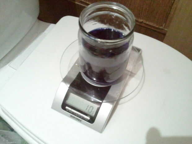 5. Retire el embudo y agregar 40ml de hidróxido de amonio 25%. ¡ ADVERTENCIA! Este hedor de reactivo! Así, mientras vas haciendo esto, intente mantener nose como lejos de la solución como sea posible. Una vez que el hidróxido de amonio se disuelve en la solución, apesta mucho menos, así que solución de activación es útil interior, aunque todavía huelen mal por lo que el recipiente con la solución no se debe dejar abierto durante mucho tiempo. La solución espesa rápidamente por algún tiempo y verás escamas blancas, pero desaparecen muy rápidamente y solución obtiene color azul profundo. Este proceso puede speedup agitando la solución.