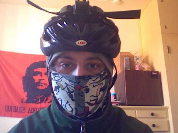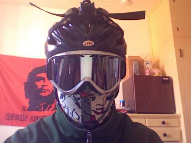 Luego viene el casco. Es probable que tenga para aflojarla para arriba para no estrangular a sí mismo con todas las capas.