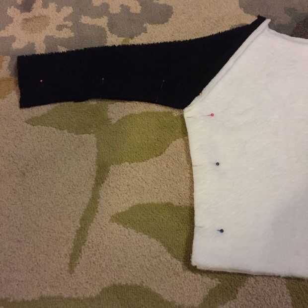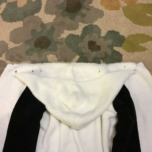 Colocar una cubierta para el cuello de la capucha. Marcó el centro de la espalda y emparejado la costura de la capucha para puestas hacia fuera para allí. Coser.