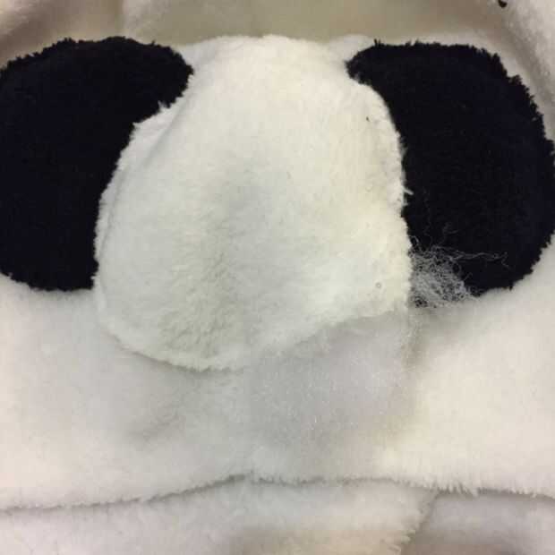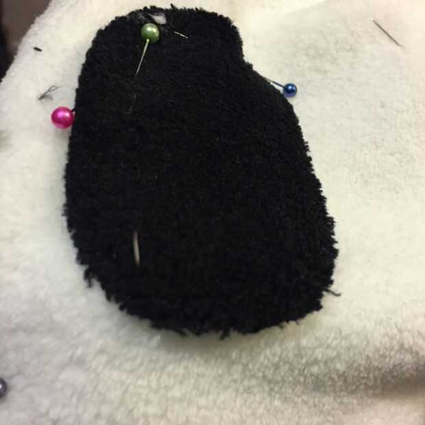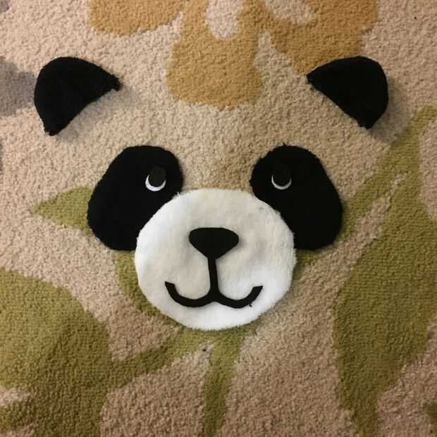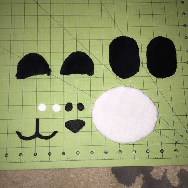 Para hacer la cara que corte una nariz redonda en blanco, dos ojos parches en negro y cuatro semicírculos para hacer las orejas. Esto es donde puede jugar y personalizarla. Hice la nariz, sonrisa y pupilas de fieltro porque es más fácil trabajar con. Puse todas las piezas en mi tabla de cortar para obtener una referencia de tamaño y proporción.