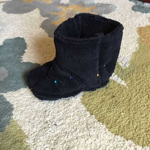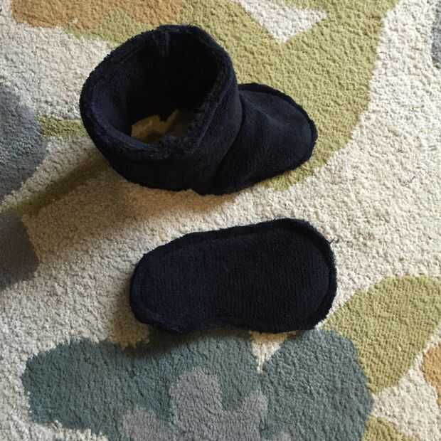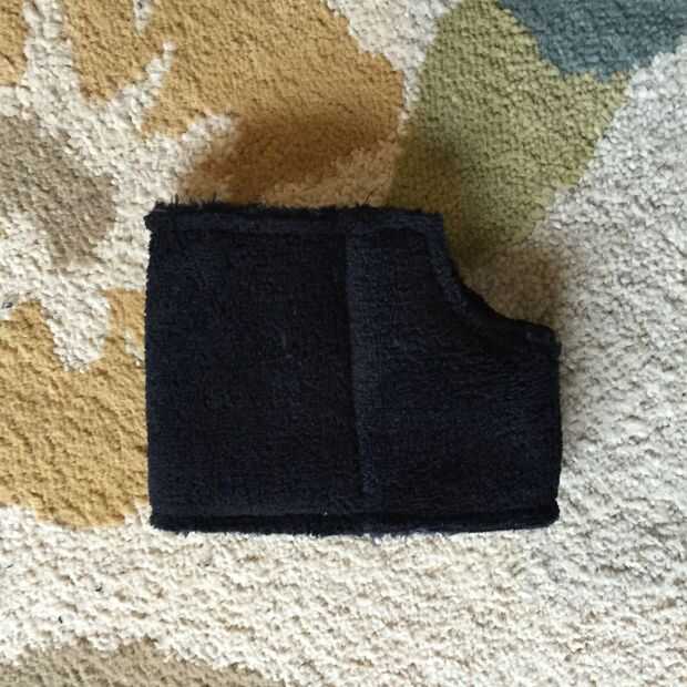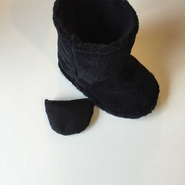 Pin 1 de las piezas para el borde del arco en el tubo. Coser el arco. Voltee y fijar la segunda pieza en la parte superior con el lado derecho mirando hacia fuera. Coser solamente el borde delantero. Se trata de un bolsillo de su calentador pequeño. Perno de la parte superior en la suela y coser los bordes.