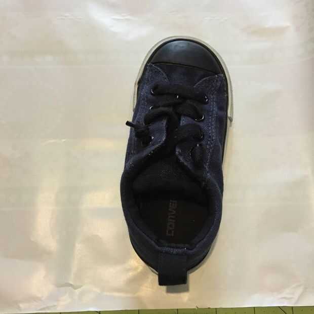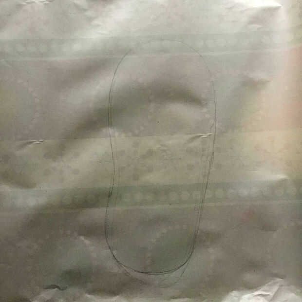 Ahora medir el borde frontal de la suela donde no entra el tubo. En una hoja de papel trazar una línea recta con la misma medida como el arco del paso anterior. Luego colocar la cinta de medir arco en esta línea (como en la foto) y combinar con la medición de vanguardia que acaba de tomar. Seguimiento de esta forma. Corte (4) de esta forma en polar negro.